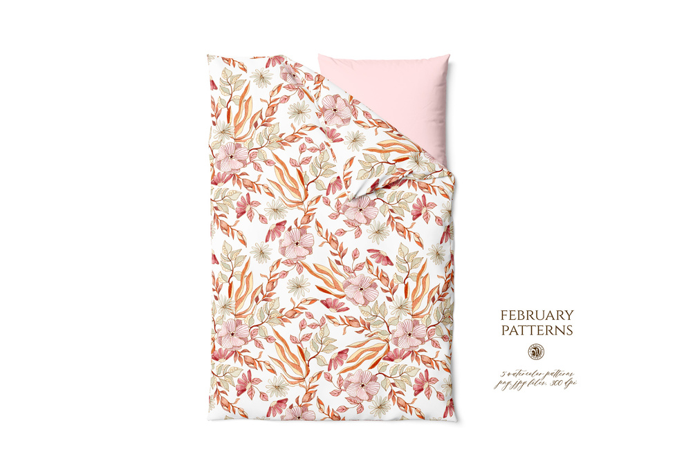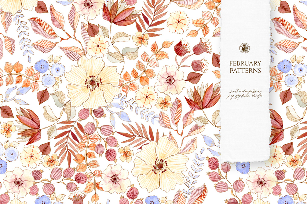 February Patterns - watercolor floral patterns set - 5 hand painted watercolor floral seamless patterns. - Ideal for invitations, business cards, branding, instagram, handmade craft items, scrap booking, printed paper, desktop wallpapers, picture frames, posters, pattern fills, surface textures, web page backgrounds, textiles, scrapbooking, invitation cards, gift wrapping and more.