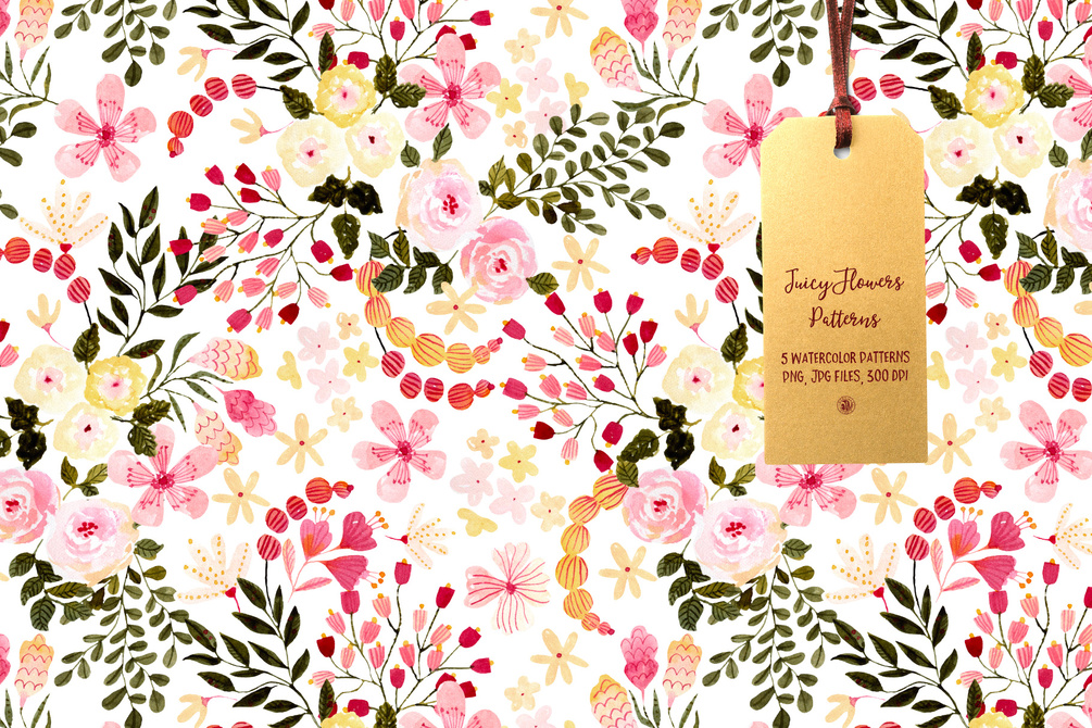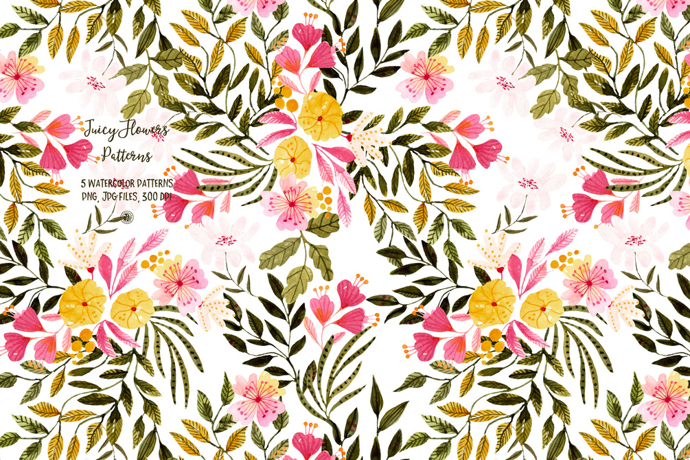 Juicy Flowers Patterns - watercolor floral patterns set - 5 hand painted watercolor floral seamless patterns. - Ideal for invitations, business cards, branding, instagram, handmade craft items, scrap booking, printed paper, desktop wallpapers, picture frames, posters, pattern fills, surface textures, web page backgrounds, textiles, scrapbooking, invitation cards, gift wrapping and more.