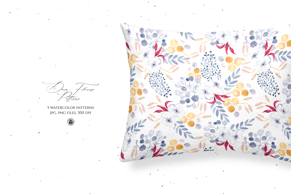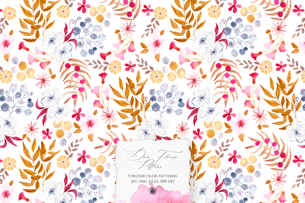 Dawn Flowers Patterns - watercolor floral patterns set - 5 hand painted watercolor floral seamless patterns. Ideal for invitations, business cards, branding, instagram, handmade craft items, scrap booking, printed paper, desktop wallpapers, picture frames, posters, pattern fills, surface textures, web page backgrounds, textiles, scrapbooking, invitation cards, gift wrapping and more.