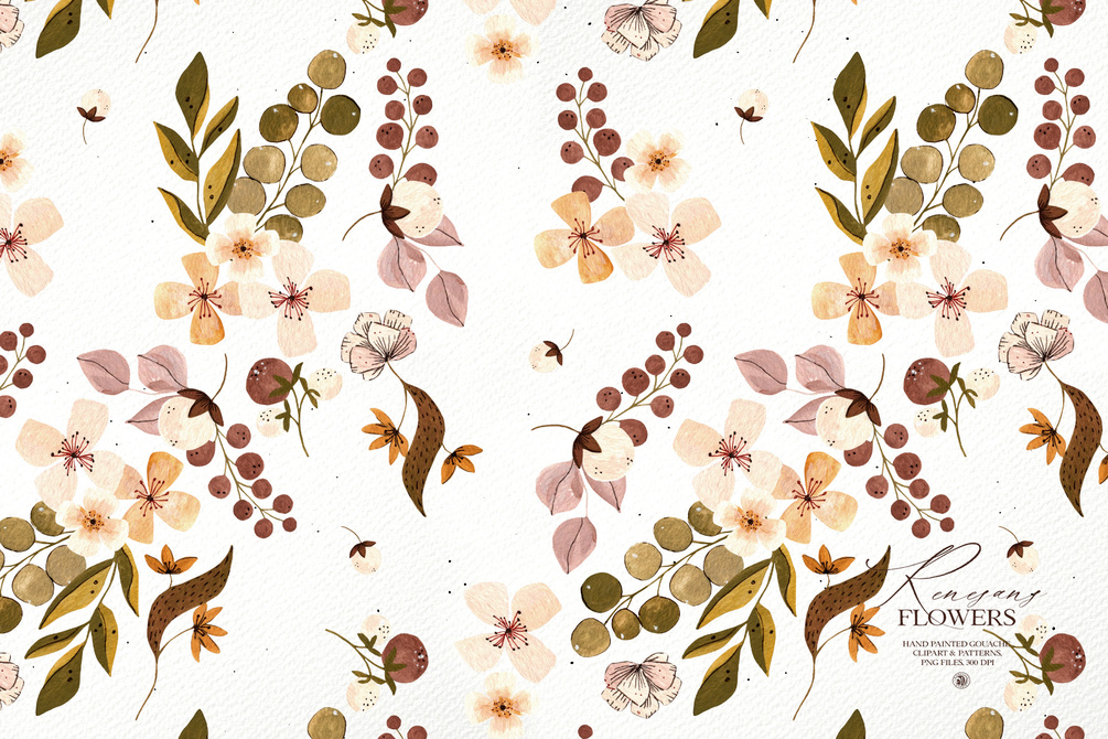 Renesans Flowers - gouache hand painted floral set and patterns - 29 clipart hand painted floral frames and wreath and 3 seamless patterns. - Ideal for invitations, business cards, branding, instagram, handmade craft items, scrap booking, printed paper items and more.