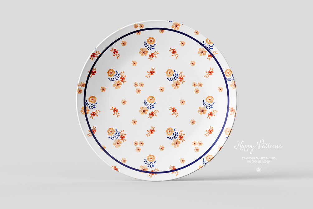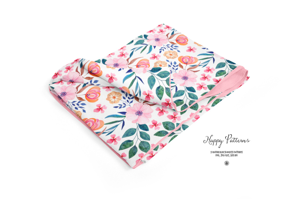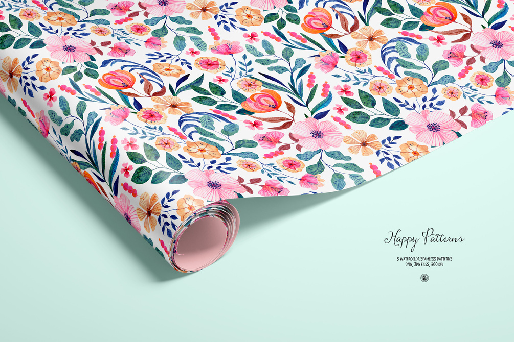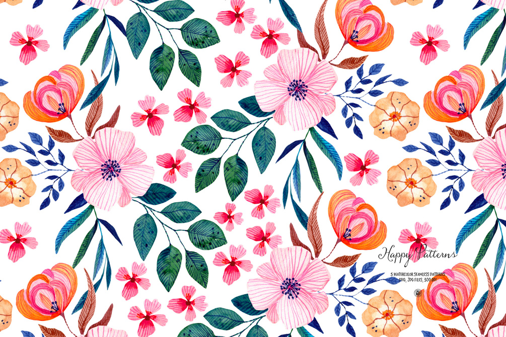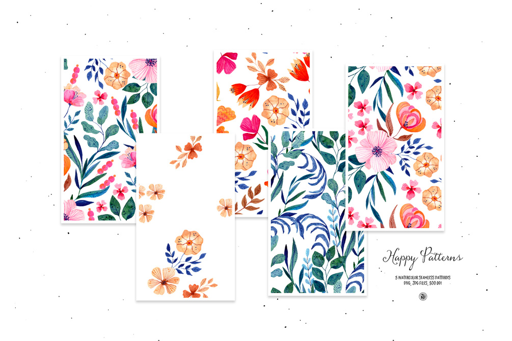 Happy Patterns - watercolor floral patterns set - 5 hand painted watercolor floral seamless patterns. - Ideal for invitations, business cards, branding, instagram, handmade craft items, scrap booking, printed paper, desktop wallpapers, picture frames, posters, pattern fills, surface textures, web page backgrounds, textiles, scrapbooking, invitation cards, gift wrapping and more.